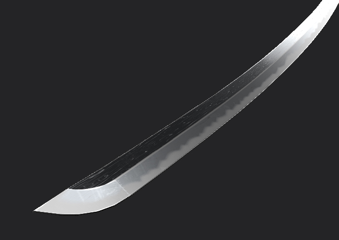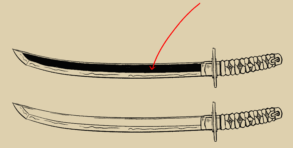 よくマンガなんかで見かけますが、下図の上のような片方の面が真っ黒になっている表現は、鏡面になった刃に周囲の光景が写り込んでいたりするために、暗く見える、と考えた方がよさそうです。